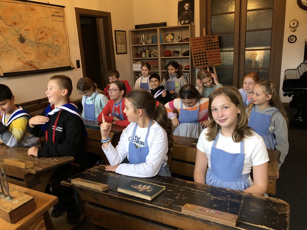 So oder so ähnlich muss es früher in der Schule gewesen sein. Die Kinder der Klassen 5c und 5d staunen nicht schlecht, wenn sie das mit ihrem Schulalltag von heute vergleichen. Nicht nur, dass die Mädchen eine Schürze trugen, während die Jungen einen Matrosenanzug anziehen durften (oder mussten), die Mädchen durften auch keine Hosen anziehen, und die Jungen trugen auch im Winter oft kurze Hosen oder hatten nur Holzpantinen an den Füßen.